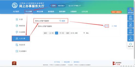 流程:登录江苏省人力资源和社会保障厅网上办事服务大厅(https://rs.jshrss.jiangsu.gov.cn),城市切换至“苏州”,选择“个人办事”,在搜索框内输入“苏州人才落户直通车”,登录个人账号(未注册的需先注册),按照提示上传资料即可。