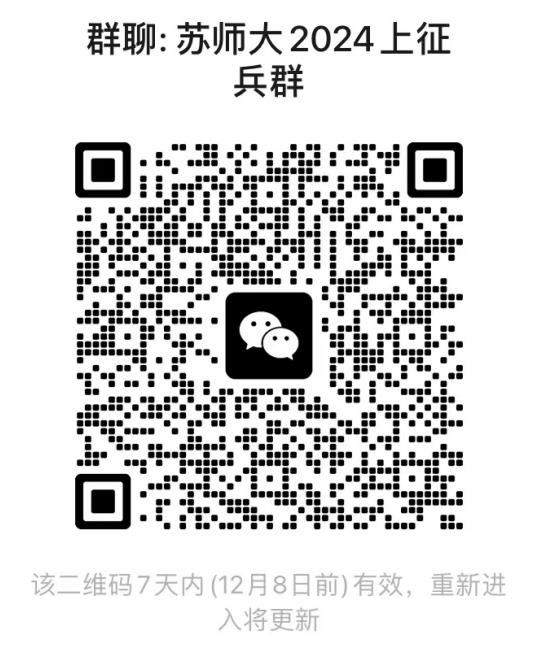 若选择从学校报名,“应征地”请选择“徐州市-泉山区-江苏师范大学”,并扫码加入学校武装部微信工作群,便于咨询和联络。计划1月10日上午集中组织到第四人民医院体检。体检合格者启动政审,体检、政审“双合格”者2月下旬参加役前教育,被批准入伍者计划3月赴部队报到。