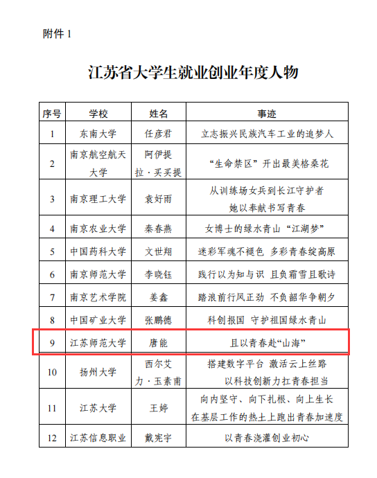 近日,江苏省教育厅公布了2023年江苏省大学生就业创业年度人物推选结果,我校推荐的2019届教育科学学院本科毕业生唐能获“江苏省大学生就业创业年度人物”荣誉称号。