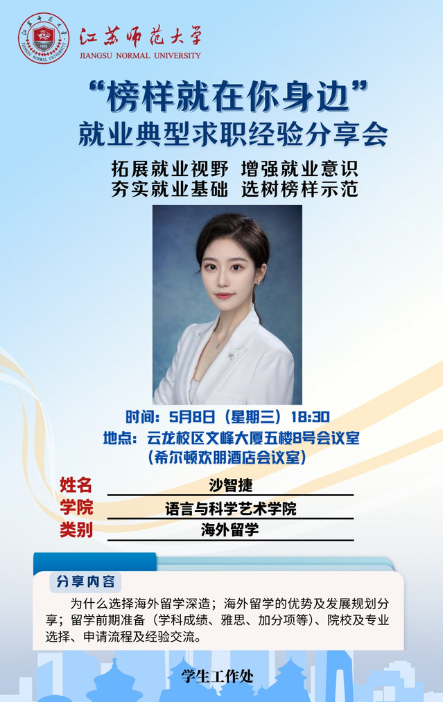 为增强学生就业意识,拓宽就业视野,夯实就业基础,学生工作处结合学生关注度高、求职意愿强烈的行业领域,开展“榜样就在你身边”就业典型求职经验分享会,充分发挥朋辈榜样的示范引领作用,帮助更多的学生提升就业竞争力。经学院推荐、学校遴选,现将第五期活动开展相关情况通知如下: