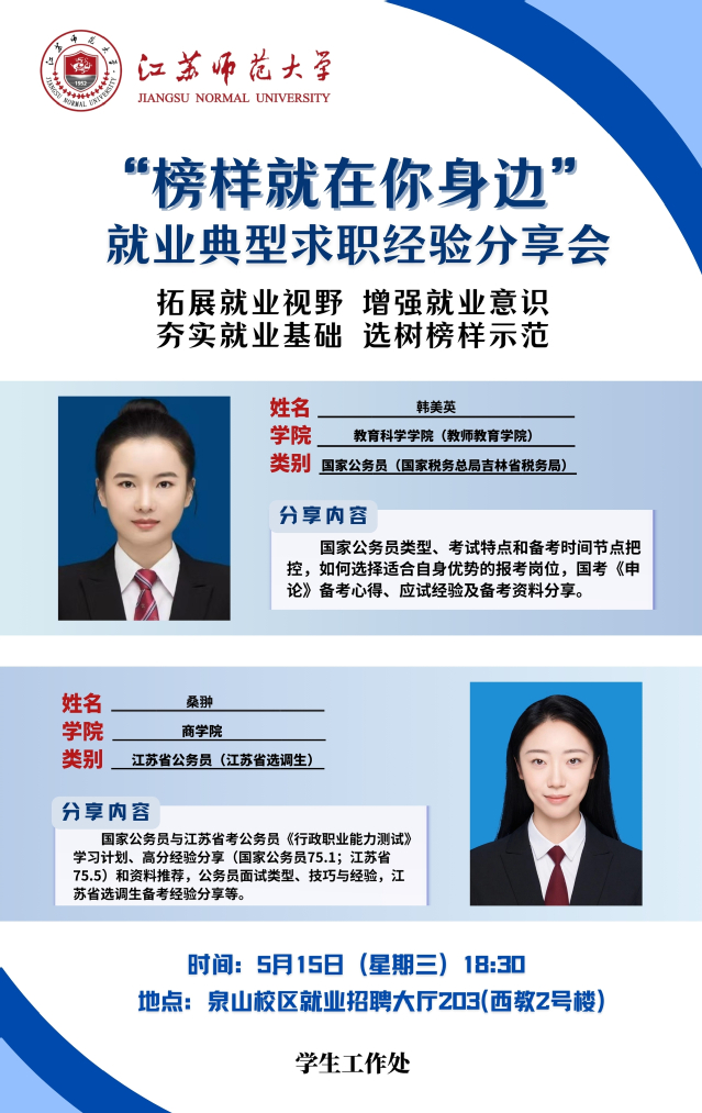 为增强学生就业意识,拓宽就业视野,夯实就业基础,学生工作处结合学生关注度高、求职意愿强烈的行业领域,开展“榜样就在你身边”就业典型求职经验分享会,充分发挥朋辈榜样的示范引领作用,帮助更多的学生提升就业竞争力。经学院推荐、学校遴选,现将第七期活动开展相关情况通知如下: