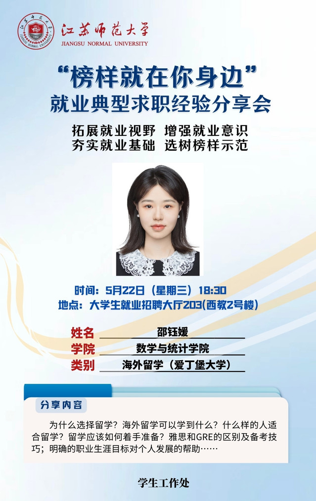 为增强学生就业意识,拓宽就业视野,夯实就业基础,学生工作处结合学生关注度高、求职意愿强烈的行业领域,开展“榜样就在你身边”就业典型求职经验分享会,充分发挥朋辈榜样的示范引领作用,帮助更多的学生提升就业竞争力。经学院推荐、学校遴选,现将第九期活动开展相关情况通知如下: